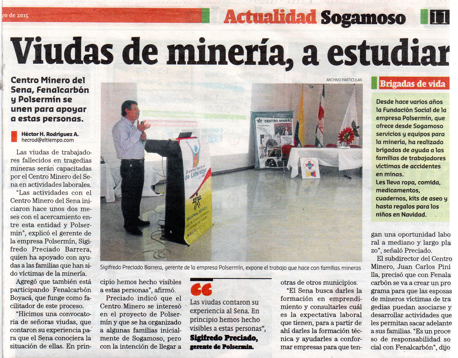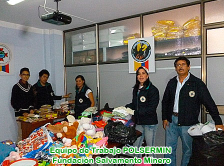 En los últimos años, con recursos de la organización POLSERMIN, hemos logrado llevar una voz de aliento a las familias (padres, viudas y huérfanos) de los mineros fallecidos, así como los discapacitados en desarrollo de la actividad minera, con la intención de mitigar el dolor y la ausencia causadas por la desaparición de quienes fueron el soporte económico de estas familias que quedan desprotegidas, entregando en diferentes municipios mineros: Mercados, kits escolares, ropa, calzado y juguetes.